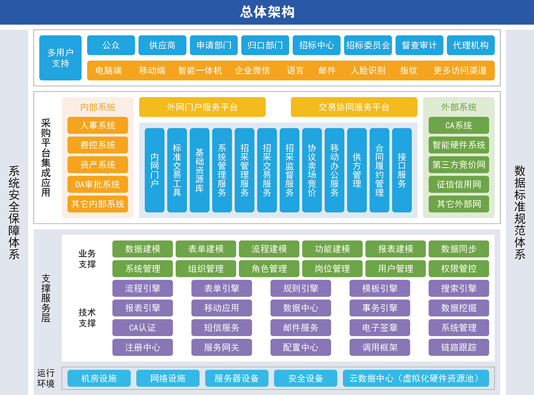 平臺的建設遵循國家電子招投標認證技術規范,按照《政府采購法》、《政府采購實施條例及細則》參考《深圳經濟特區政府采購條例》《深圳經濟特區政府采購實施條例細則》的要求建設招標采購信息化系統。按照互聯網+招標采購行動方案的建設要求,實現我校電子招投標系統全流程無紙化、數字化、智能化管理。