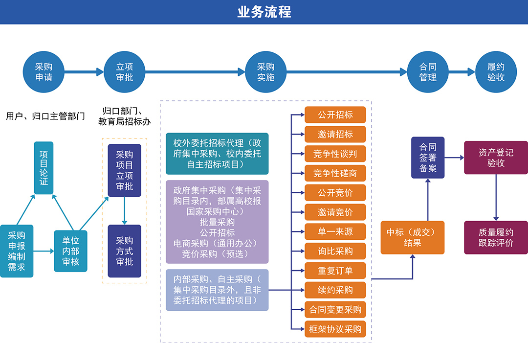 通過建設招標采購管理服務,統一校內、校外采購管理項目的統一來源入口。所有學校采購業務都通過財務部們預算管理對接實現采購需求管理、采購計劃管理、采購實施計劃、采購立項審批、招標文件審批、采購結果審批、采購變更管理、投訴質疑管理、專家管理、采購內控審計管理、框架協議采購管理、采購績效評價管理。