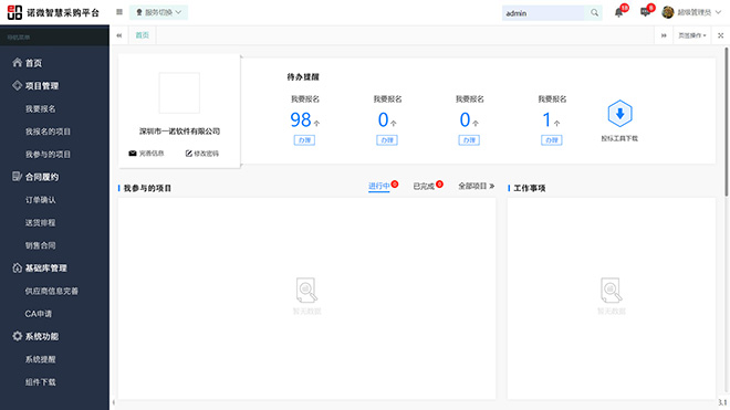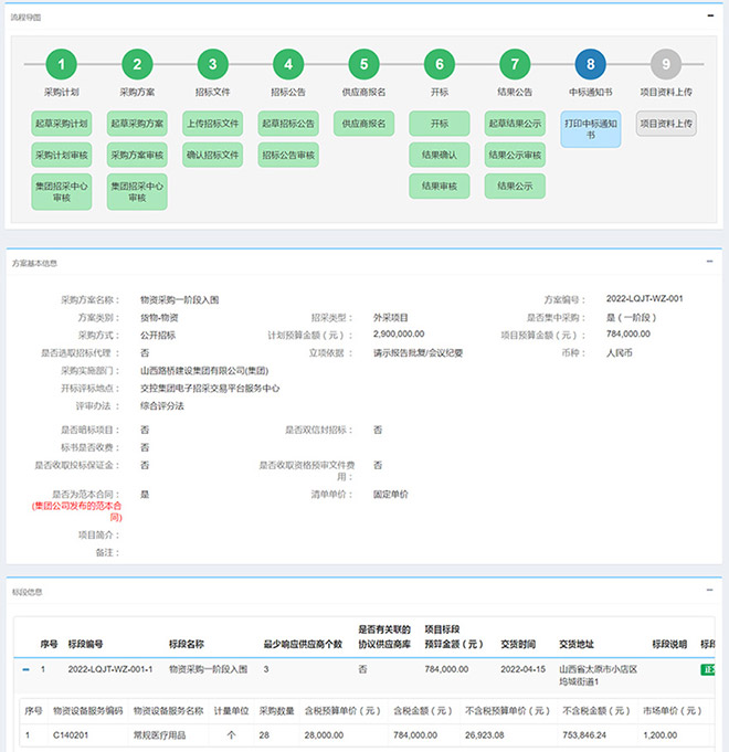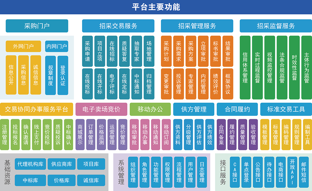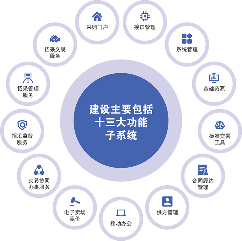 招采一體化管理監督子系統、合同履約管理系統、供方管理系統、基礎信息庫、移動辦事審批。