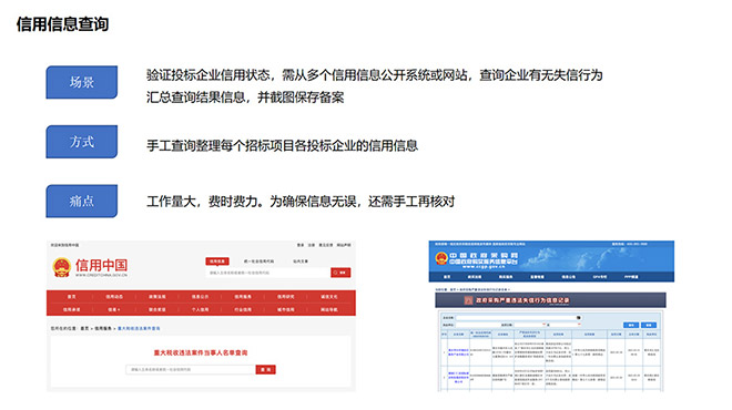 信用體系監控:我們通過智能RPA技術獲取供應商信用采集報告,在供應商報名、投標評審、簽訂合同等事前環節,進行供應商信用預警提醒。對黑名單供應商進行實時監控。讓不誠信供應商無處遁形。