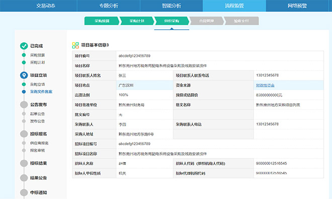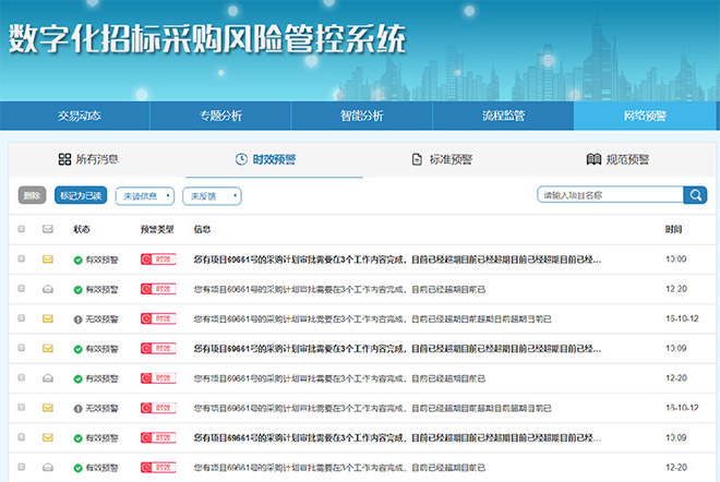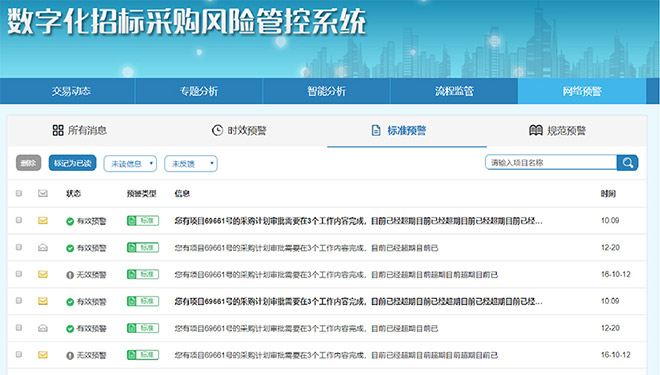 系統按照采購內控管理制度和政府采購法律和負面清單要求,建立一整套監管規則,設置風險監控點,對采購全過程生命周期進行實時監控。