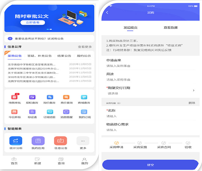 高校、醫院采購與招投標管理系統除了提供基于瀏覽器的方式外,具備對接釘釘或企業微信等移動端應用展現方式,提供采購審批、預警提醒、消息通知、采購查詢、在線競價等功能,方便用戶進行即時通訊和業務的離線處理。