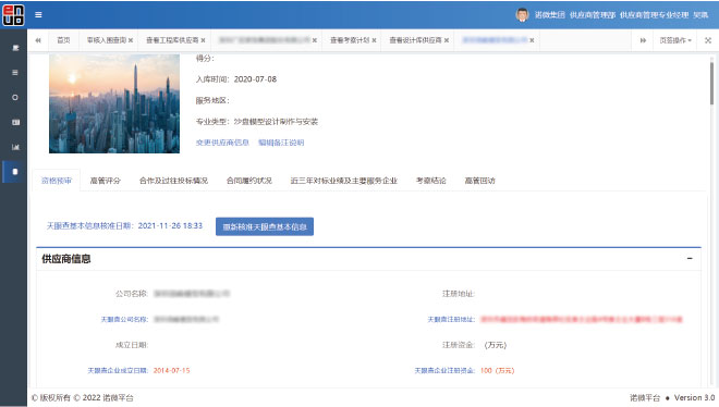 供應商通過門戶注冊并審核通過的供應商加入供應商庫,實現供應商信息變更調整,供應商分類分級管理,實現對接第三方系統,通過RPA技術自動查詢生成企業信用報告,開展績效評估即黑名單管理。