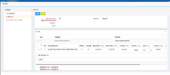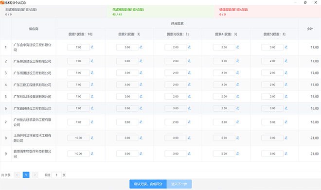 開標后評標專家依據采購單位的招標要求和供應商的投標文件進行對比,在線上進行評標,各專家評標完后系統根據設置的相應評標規則生成供應商得分統計排序表。