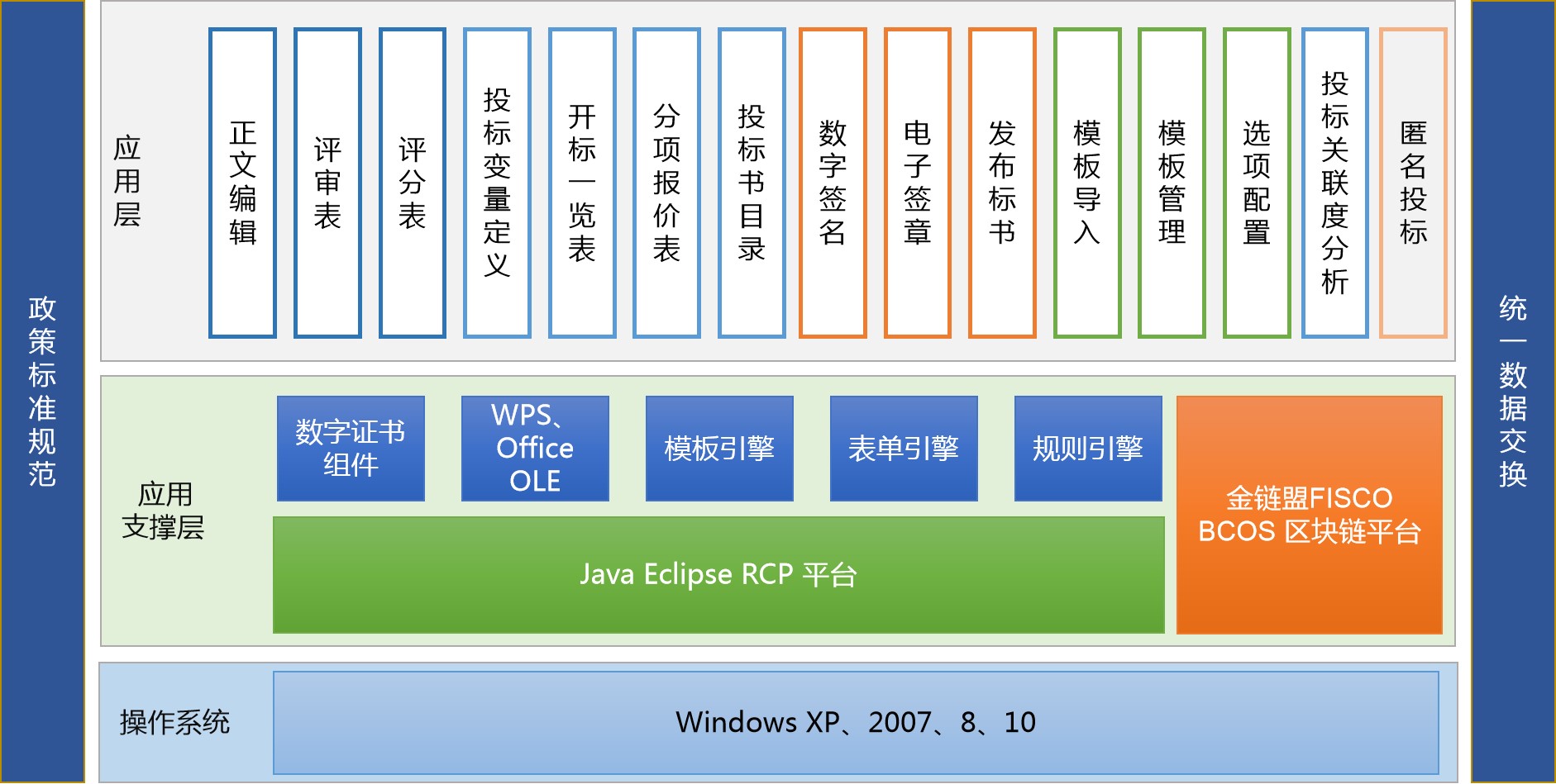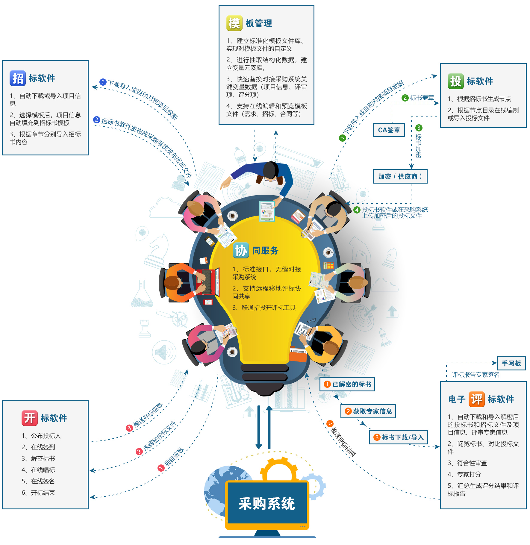 協同工具軟件:提供標準接口與任何第三方電子招投標交易系統進行無縫對接,對已經投資建設了招標采購交易系統的客戶,可快速跨越到在線全流程無紙化的招投開評標業務。協同服務系統,也可以獨立創建項目信息、用戶信息,集成鏈接對接到招、投、開、評工具,可以獨立運行使用滿足電子招投標業務實現標準化招標文件制作、電子投標文件編制和在線加密投標、遠程不見面在線開標及解密和簽名、遠程異地分散評標實現專家在線評標。